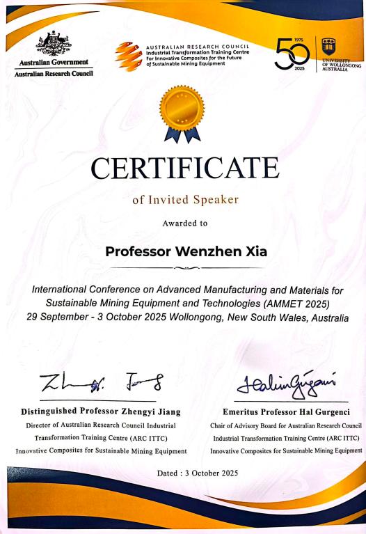 夏文真教授应邀赴澳大利亚伍伦贡,参加“2025年可持续采矿设备与技术的先进制造与材料国际会议(AMMET 2025)”。本次大会由澳大利亚研究委员会工业转型培训中心——“面向可持续采矿设备未来的创新复合材料中心”主办,汇聚了来自全球百余位专家学者,围绕先进材料制造、人工智能在矿业中的应用、绿色采矿技术等前沿主题展开了深入研讨与交流。
