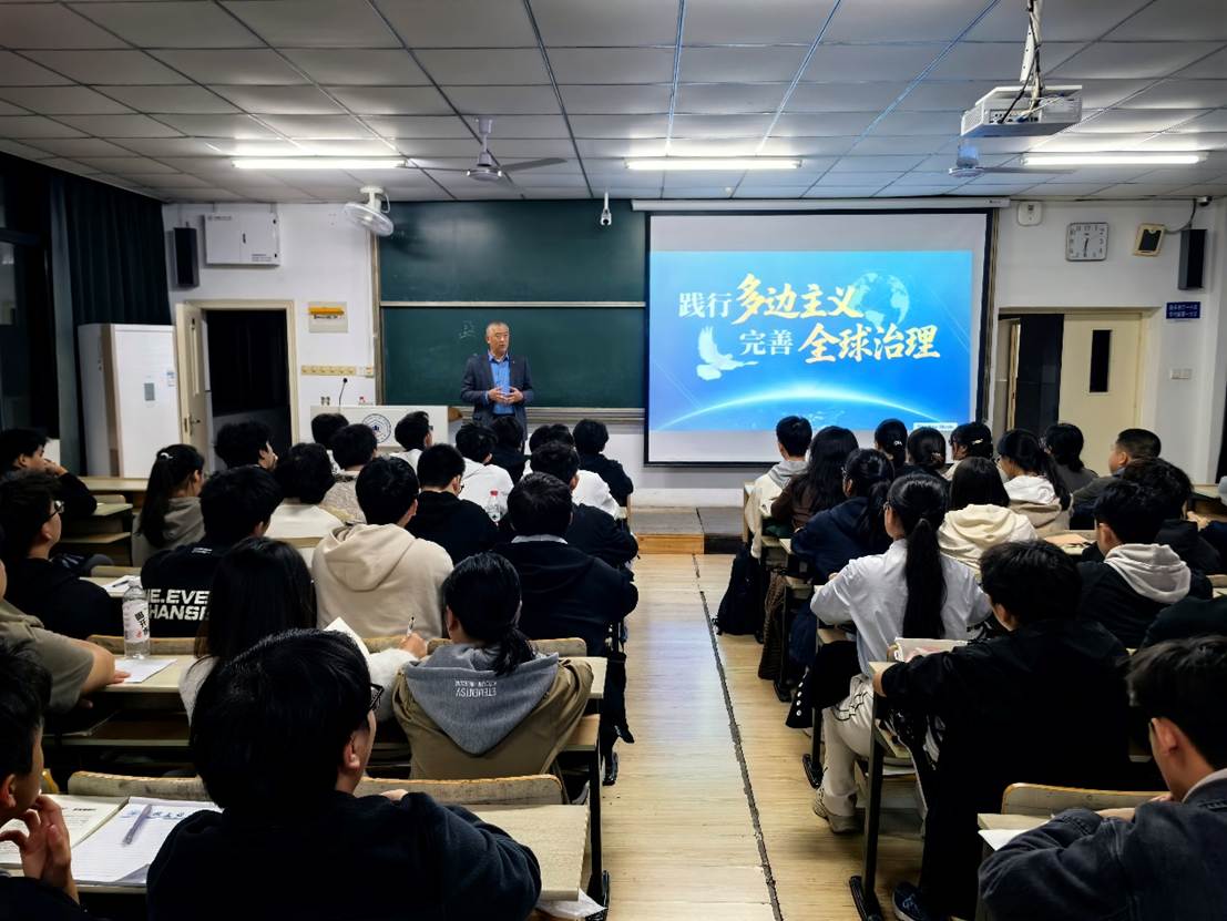 本次课程以《践行多边主义 完善全球治理》为主题。授课中,闵凡飞首先引导同学们正确认识当前“变乱交织的国际形势”,并以此为背景,深入阐述了在百年变局加速演进的当下,“凝聚全球治理的国际共识”的紧迫性与重要性。剖析了全球治理体系面临的挑战与机遇,并重点讲解了“彰显时代之问的中国答卷”。他勉励同学们,作为新时代的青年学子,要胸怀“国之大者”,主动关心国家大事和世界局势,不断提升自己的政治素养和全局视野,将个人成长融入国家发展的宏伟蓝图。