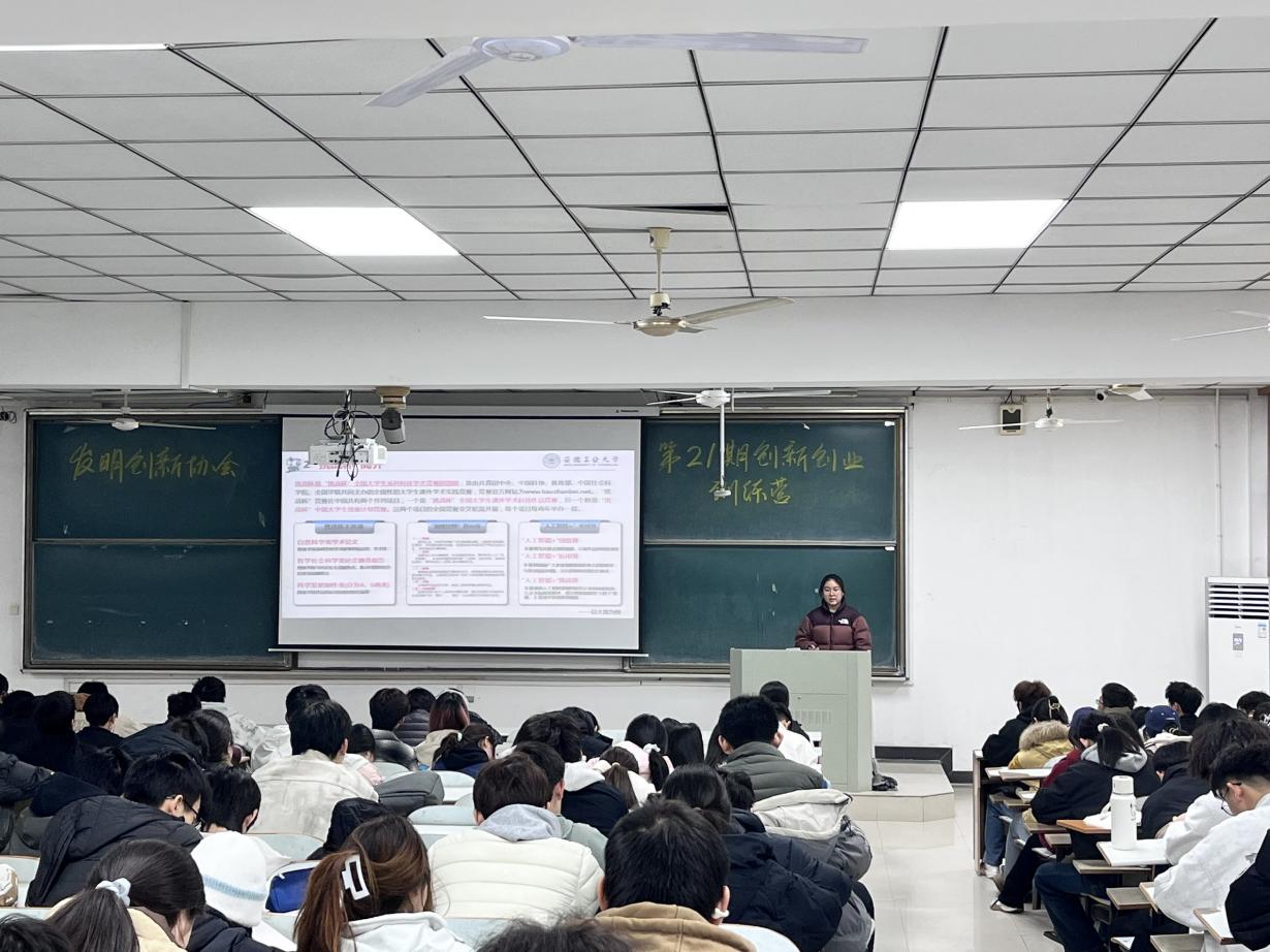 第21期创新创业训练营开营仪式暨首场专题讲座在佳山校区教三南401教室顺利举行。院团委书记、发明创新协会指导老师张夏主持活动并作动员讲话,300余名同学共同参加了本次活动。
